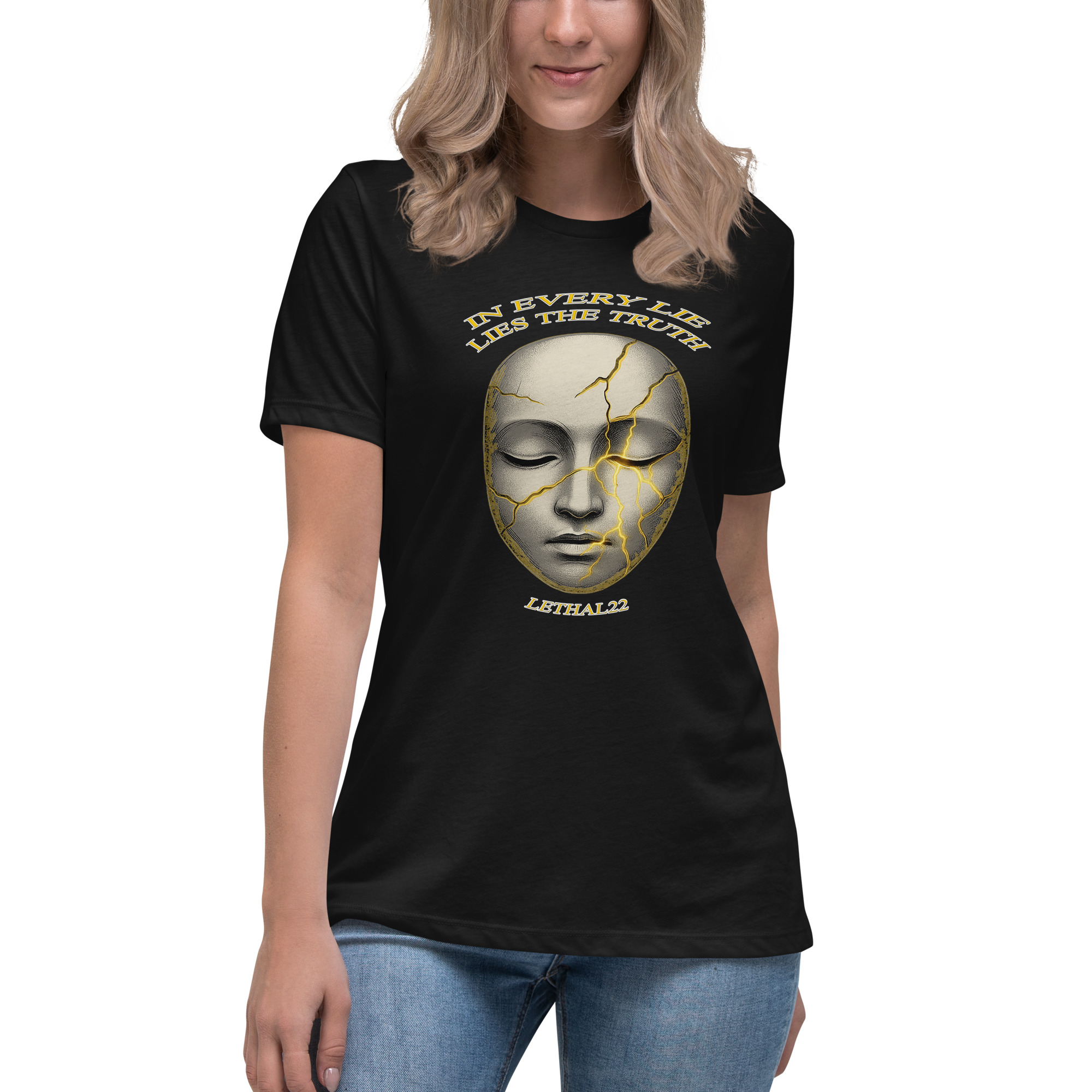 The cracked-gold mask design embodies resilience — truth breaking through deception — with radiant detail that makes a statement without saying a word.