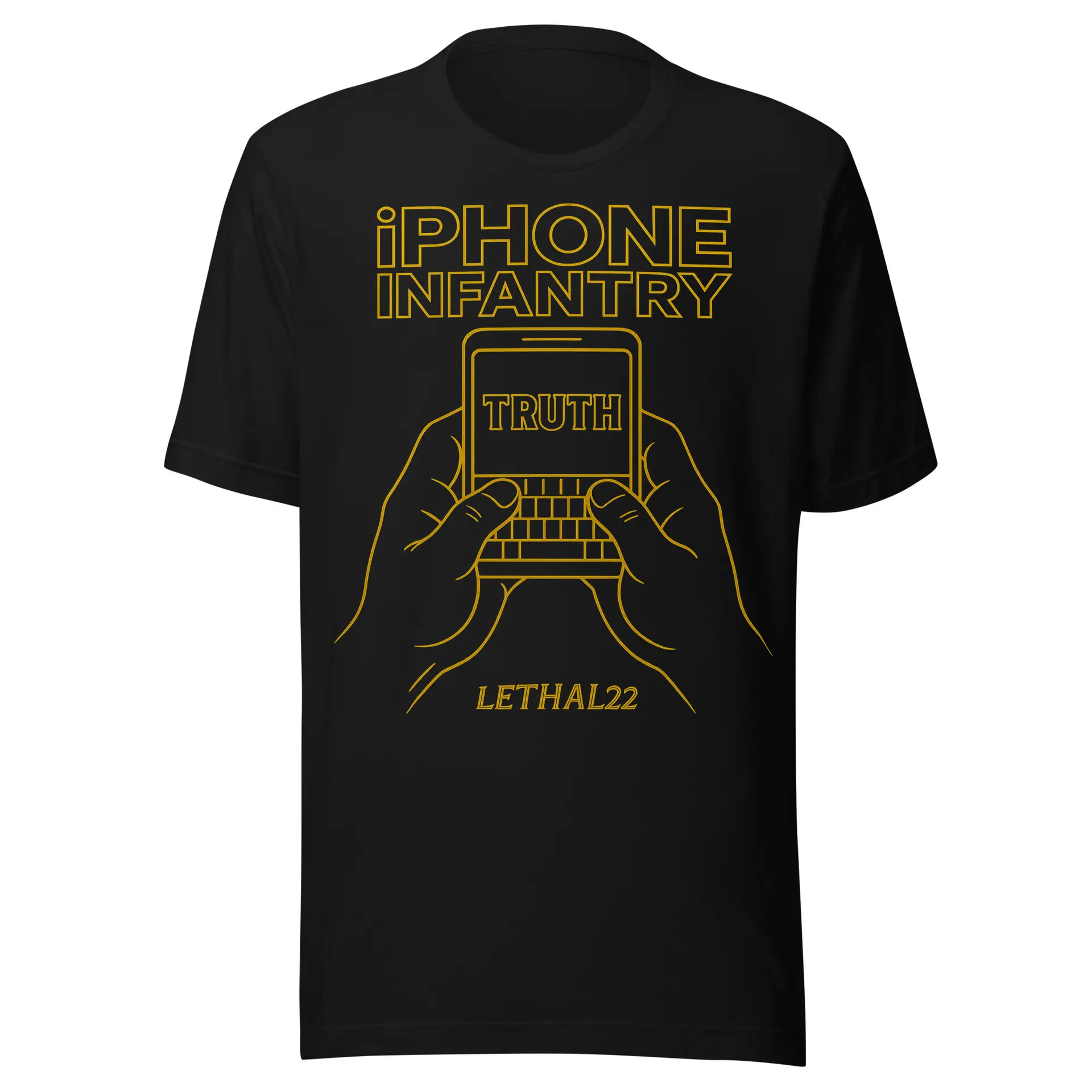 Rendered in sleek gold line art, this design showcases two hands gripping a phone, the word TRUTH illuminated at its core — a modern insignia of consciousness, courage, and connection. It’s not just a phone; it’s a beacon. A symbol that knowledge is power, and silence is surrender.
